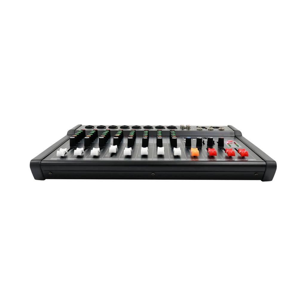 El PM80S es un mezclador compacto con 8 canales de entrada, ideal para aplicaciones pequeñas y medianas.